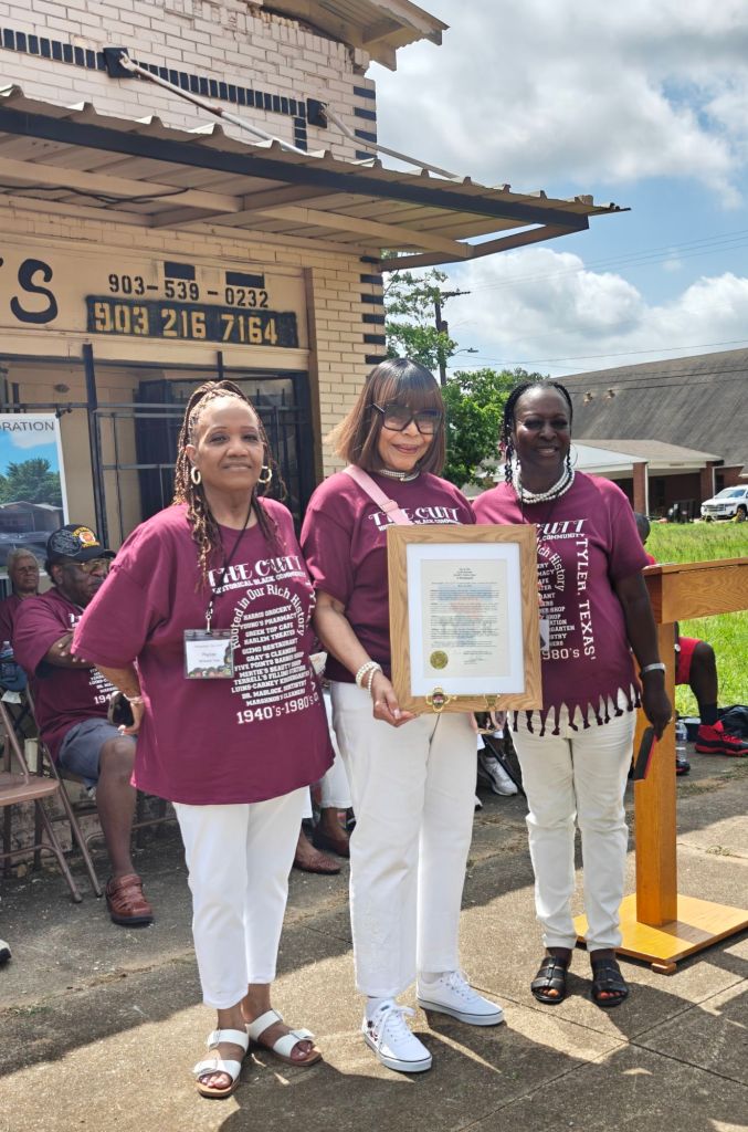 Former City Councilmember Dr. Shirley McKellar delivered a Key to the City and Proclamation from the City of Tyler, commemorating May 24 as the official “Day of Remembering the Cutt” in Tyler, and citing the contributions of the business district to the overall culture and history of Tyler, TX.